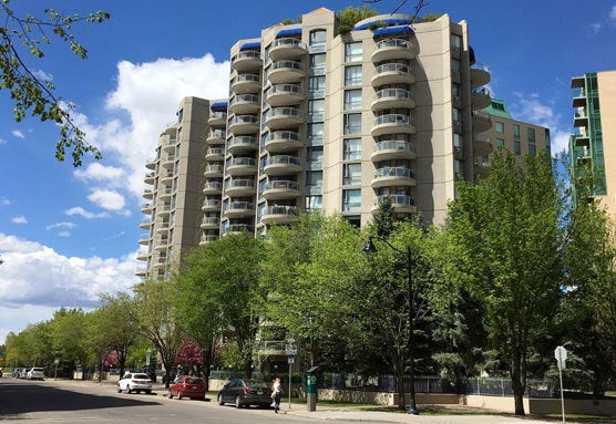 All units are 1 or 2 bedroom plans with dens and have generous balconies to enjoy the sights of downtown Calgary and the Bow river valley. Units have titles parking stalls and there's also a number of visitor stalls. Amenities include a tennis court, exercise room and a meeting with with kitchen and access to a landscaped terrace.